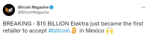 비트코인 매거진에 따르면 멕시코 최대 소매 프렌차이즈 중 하나인 엘렉트라(Elektra)가 비트코인을 결제 옵션에 추가했다. 엘렉트라는 이를 위해 암호화폐 결제 서비스사 비트페이(BitPay)와 파트너십을 체결했다. 이용자는 해당 사이트를 통해 상품 가격을 비트코인으로 결제할 수 있다.