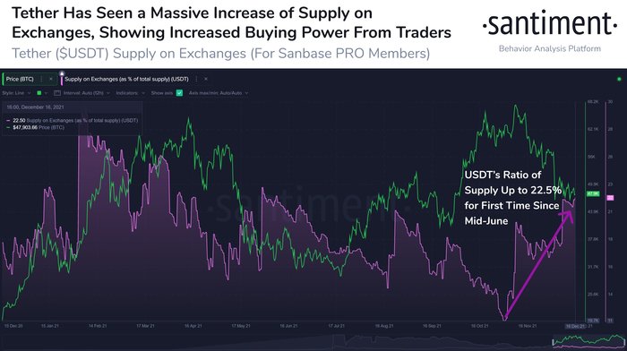 암호화폐 전문 미디어 유투데이가 샌티멘트의 데이터를 인용 "16일(현지 시간) 기준 암호화폐 거래소 내 USDT 보유량이 약 90억 달러를 기록하고 있다. 이는 지난 6개월간 가장 높은 수치로, 트레이더들의 비트코인 매집이 본격화될 수 있음을 암시한다"고 17일 보도했다. 이와 관련 샌티멘트 소속 애널리스트는 "거래소 보유 USDT 물량이 전체 유통량의 22.5% 수준까지 올라왔다. 스테이블코인이 거래소에 축적되고 있다는 것은 트레이더들의 구매력이 상승하고 있다는 것을 의미한다"고 설명했다. 또 암호화폐 데이터 분석 업체 글라스노드에 따르면, 비트코인 채굴자들이 거래소로 입금한 비트코인 물량이 최근 급감하고 있는 것으로 나타났다. 해당 지표(7일 평균)는 약 2.655 BTC를 기록하며 최근 5년간 최저 수치를 기록했다. 이는 매도세 약화로 이어져 비트코인 강세 전환 가능성을 암시한다고 유투데이는 분석했다.