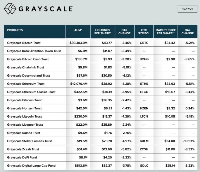 암호화폐 투자펀드 그레이스케일이 공식 트위터를 통해 12월 17일 기준 총 운용자산(AUM) 규모가 약 439억 달러를 기록했다고 밝혔다. 그레이스케일 비트코인 트러스트(GBTC) 판매 단위 가격은 전날 대비 5.21% 하락한 34.42 달러, 그레이스케일 이더리움신탁(ETHE)은 5.51% 하락한 33.93 달러에 거래되고 있다.