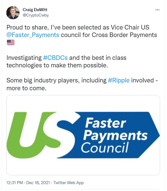 리플(XRP) 프로덕트 총괄 크레이그 드윗(Craig DeWitt)이 18일 자신의 트위터를 통해 미국 내 지불결제 사업자그룹 FPC(The U.S. Faster Payments Council)의 부의장으로 합류했다고 밝혔다. 이와 관련해 그는 "국경 간 결제를 위한 FPC 미국 부의장에 선출됐다. 해당 그룹에는 리플을 비롯한 일부 대기업들이 회원사로 참여하고 있다. FPC는 CBDC와 이를 구현하는 기술들을 연구하고 있다"고 설명했다.
