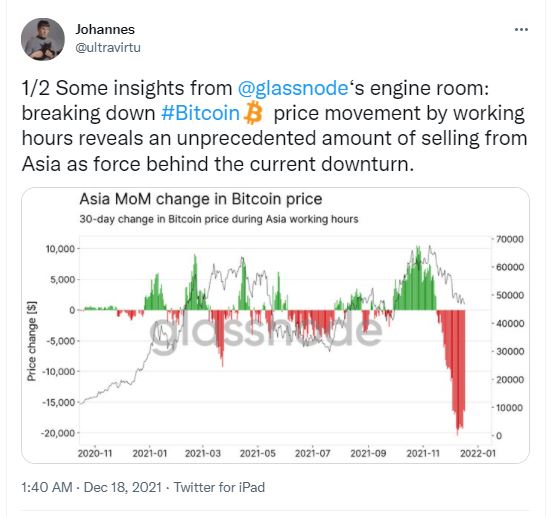 암호화폐 온체인 애널리스트 요하네스(Johannes)가 18일 자신의 트위터를 통해 "암호화폐 데이터 분석 업체 글라스노드의 최신 데이터에 따르면, 이번 비트코인 가격 하락은 아시아 시장에서 발생한 '거대한' 매도세가 주요 원인"이라고 진단했다. 이와 관련해 그는 "아시아발 매도세는 시간이 지나면서 점차 약화되고 있다. 반면, 미국 및 유럽연합 지역 트레이더들이 주도하는 매수세가 힘을 받고 있다"고 부연했다.