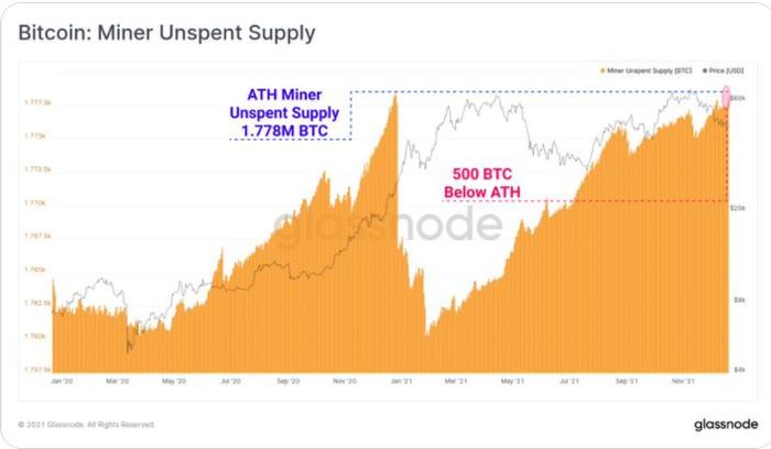 글래스노드가 트위터를 통해 "BTC 채굴자들의 미사용 공급(unspent supply) 규모가 역대 최대 기록보다 불과 500 BTC 낮은 수준"이라며 "지난해 3월부터 채굴자들은 대량의 BTC를 축적하기 시작했다"고 전했다. 미사용 공급이란 채굴에 대한 보상으로 발행됐으나 온체인 상에서 한 번도 사용된 적 없었던 것을 의미한다.