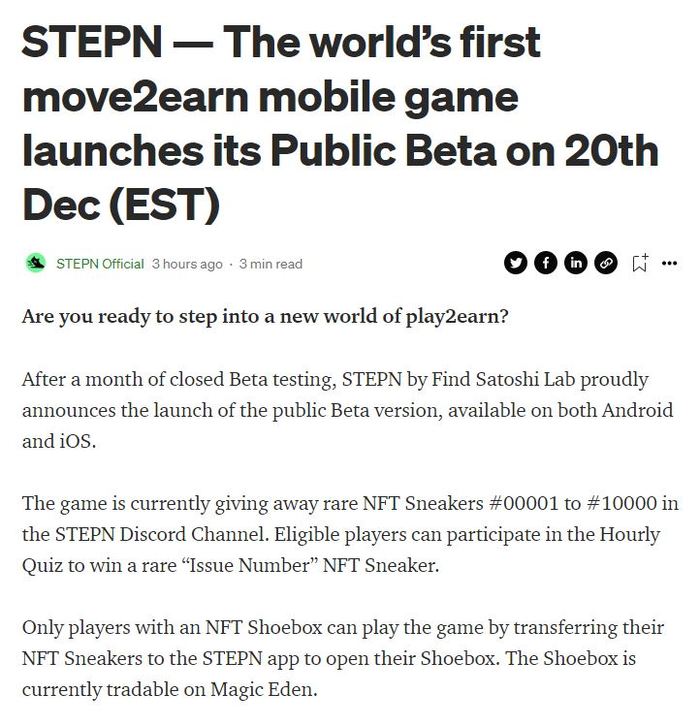 솔라나(SOL) 기반 '무브투언'(move2earn) NFT 게임 스테픈(STEPN)이 공식 블로그를 통해 스테픈 퍼블릭 베타 버전을 출시했다고 밝혔다. 스테픈은 앞서 약 1개월간 스테픈 모바일 게임의 클로즈 베타 테스트를 진행한 바 있다. 스테픈 퍼블릭 베타 버전은 현재 안드로이드 및 iOS 버전을 지원하고 있다.