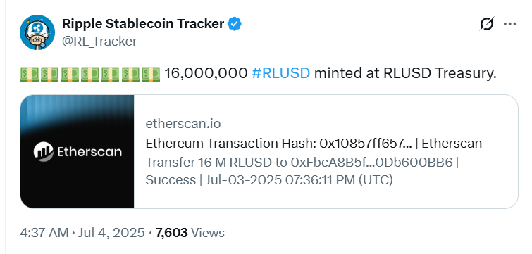 7월 3일(현지시간) 암호화폐 전문매체 코인게이프에 따르면, 리플은 자사 재무부 지갑을 통해 1,600만 RLUSD를 새롭게 발행했다. RLUSD는 달러와 1:1로 연동된 스테이블코인으로, 이번 발행으로 유통량이 더욱 증가했다. 특히 AMINA은행은 RLUSD를 직접 보관하고 거래 서비스까지 제공하겠다고 밝히며, 전 세계 최초로 해당 스테이블코인을 지원하는 은행으로 이름을 올렸다.