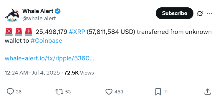 7월 3일(현지시간) 암호화폐 전문매체 유투데이에 따르면, 온체인 분석 플랫폼 웨일얼럿(Whale Alert)은 해당 날짜에 2,549만 8,179 XRP, 약 5,781만 1,584달러 규모의 대형 트랜잭션이 코인베이스로 전송된 것을 포착했다. 이 거래는 단일 주소에서 실행된 것으로 확인되며, 일시적으로 매도 신호로 해석돼 시장에 혼란을 초래했다.