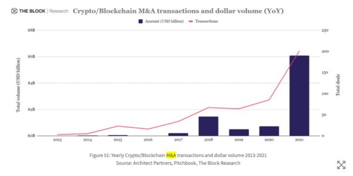 암호화폐 전문 미디어 더블록 산하 리서치 기관 더블록리서치가 올해 암호화폐 M&A 규모가 131% 급증했다고 발표했다. 더블록리서치가 최근 발표한 '2022년 디지털자산 전망 보고서'에 따르면 올해 지금까지 M&A가 197건 이상이 완료, 지난해(85건) 대비 약 131% 증가한 것으로 나타났다. 미디어는 부티크 M&A 컨설팅기업 아키텍트 파트너(Architect Partners)의 보고서를 인용, 탈중앙화 애플리케이션(dApp)이 등장함에 따라 비암호화폐 기업이 자신의 포지셔닝을 위해 공격 혹은 방어적으로 해당 기업들을 인수하고 있다고 평가했다.