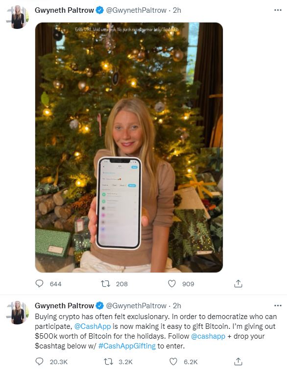 할리우드 스타 기네스 펠트로(Gwyneth Paltrow)가 트위터를 통해 스퀘어의 모바일 결제 서비스인 캐시앱(Cash App)과 제휴했다고 밝혔다. 그는 "팬들에게 50만 달러 상당의 비트코인을 기부한다"며 "암호화폐가 매우 마초적으로 들리지만 이것은 젊은 기술자만을 위한 것이 아니다. 원한다면 누구든 쉽게 암호화폐에 접근할 수 있다"고 말했다. 기네스 펠트로는 크리스마스 트리 앞에서 캐시앱을 사용하고 있는 사진을 함께 게재했다.