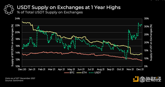 델파이 디지털이 샌티멘트 데이터를 인용, 거래소에 있는 테더(USDT) 물량이 11월 초 10% 수준에서 현재 31%로 증가하며 1년래 신고점을 기록했다고 전했다.