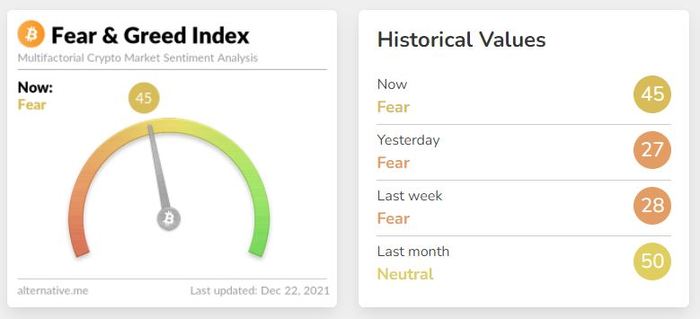암호화폐 데이터 제공 업체 알터너티브(Alternative)의 자체 추산 '공포·탐욕 지수'가 전날보다 18 포인트 오른 45를 기록했다. 투심이 개선됐지만 공포 단계는 유지됐다. 해당 지수는 0에 가까울수록 시장의 극단적 공포를 나타내며, 100에 가까울수록 극단적 낙관을 의미한다. 공포 탐욕 지수는 변동성(25%), 거래량(25%), SNS 언급량(15%), 설문조사(15%), 비트코인 시총 비중(10%), 구글 검색량(10%) 등을 기준으로 산출된다.