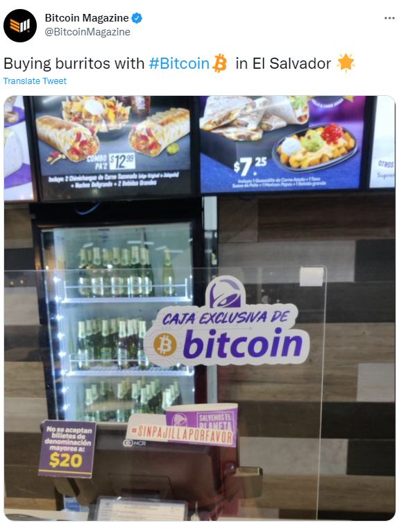 비트코인 매거진 트위터 계정이 멕시코 음식 체인 타코벨(Taco Bell)이 엘살바도르 내 비트코인 결제를 지원한다고 전했다.