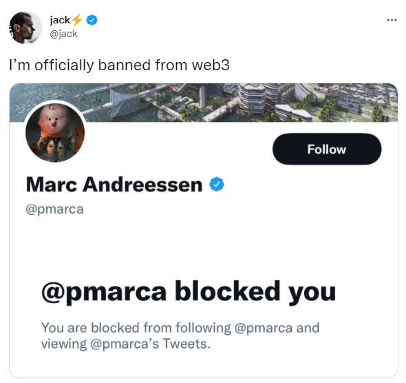 잭 도시 트위터 창업자 겸 블록(구 스퀘어) CEO가 자신의 트위터를 통해 "웹 3에게 공식적으로 금지를 당했다"고 말했다. 해당 내용과 함께 잭 도시는 a16z(앤드리슨 호로위츠) 설립자 마크 안데르센(Marc Andreessen)이 자신의 계정을 차단한 사진을 게재했다. 앞서 잭 도시는 일론 머스크 테슬라 CEO가 web3를 본 사람이 있냐고 묻자, "a와 z 사이 어딘가에 있다"고 대답했다. 이는 a16z를 가리킨 것으로 보인다.