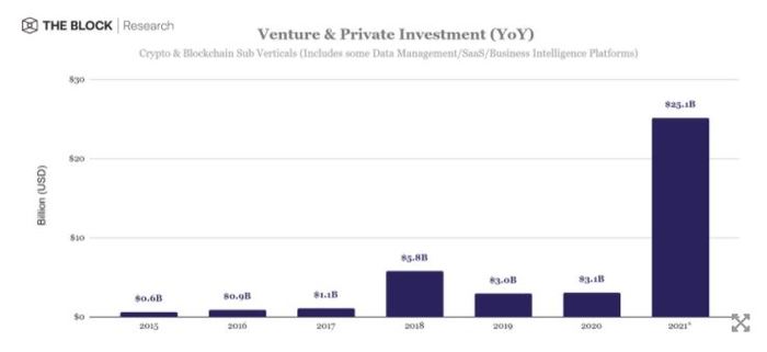 더블록 리서치(The Block Research)가 발표한 최신 보고서에 따르면 2021년 한해 동안 1,700건 이상의 암호화폐 벤처캐피탈 펀딩이 완료, 전년 대비 약 126% 증가한 것으로 나타났다. 이에 따라 약 251억 달러 규모의 투자가 유치됐으며, 이는 전년 대비 약 719% 증가한 수치다. 또한 올해 유니콘(기업 가치 10억 달러 이상) 지위를 획득한 암호화폐 기업은 65개 이상으로, 이는 2년을 기준으로 볼 때 약 491% 증가한 수치이다. 최근 유니콘 지위를 획득한 암호화폐 기업으로는 FTX, 알케미(Alchemy), 택스비트(TaxBit), 듄 애널리틱스(Dune Analytics) 등이 있다.
