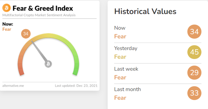 암호화폐 데이터 제공 업체 알터너티브(Alternative)의 자체 추산 '공포·탐욕 지수'가 전날보다 11 포인트 내린 34를 기록했다. 투심이 위축되며 공포 단계는 계속됐다. 해당 지수는 0에 가까울수록 시장의 극단적 공포를 나타내며, 100에 가까울수록 극단적 낙관을 의미한다. 공포 탐욕 지수는 변동성(25%), 거래량(25%), SNS 언급량(15%), 설문조사(15%), 비트코인 시총 비중(10%), 구글 검색량(10%) 등을 기준으로 산출된다.