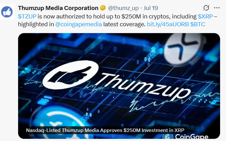 섬즈업 주가는 7월 18일 14.32달러로 마감해 당일에만 13.74% 급등했다. 연초 대비 317%, 한 달간 109% 상승하며 암호화폐 자산 확장 전략에 대한 투자자 기대감을 반영했다. 특히 XRP가 사상 최고가인 3.65달러를 기록하면서, 디지털 자산에 대한 시장 관심이 한층 고조되고 있다. 현재 XRP는 3.42달러에 거래되고 있으며, 최근 7일간 26% 상승했다.