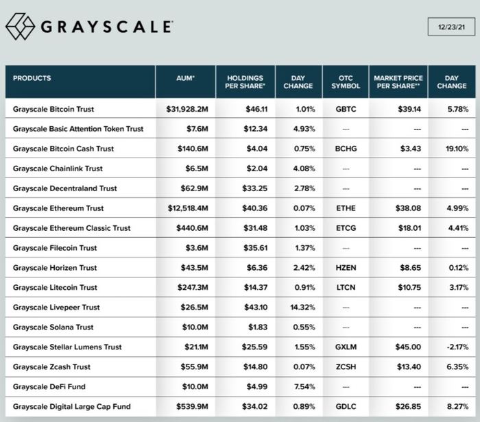 암호화폐 투자펀드 그레이스케일이 공식 트위터를 통해 12월 23일 기준 총 운용자산(AUM) 규모가 약 461억 달러를 기록했다고 밝혔다. 그레이스케일 비트코인 트러스트(GBTC) 판매 단위 가격은 전날 대비 5.78% 상승한 39.14 달러, 그레이스케일 이더리움신탁(ETHE)은 4.99% 상승한 38.08 달러에 거래되고 있다.