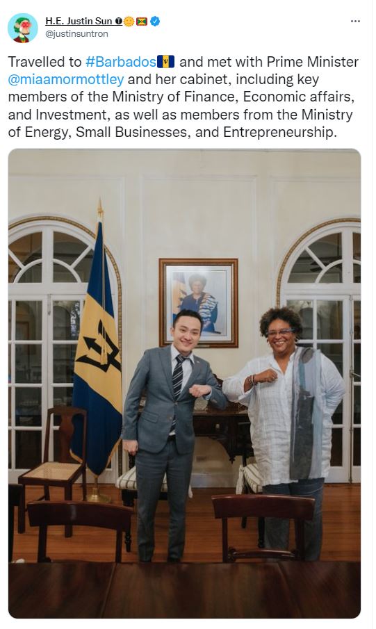 저스틴 선 트론(TRX) 창업자가 방금 전 자신의 트위터를 통해 "미아 모틀리 바베이도스 총리 및 내각과 만났다"고 밝혔다. 앞서 지난 24일 저스틴 선은 도미니카공화국 수상 루즈벨트 스케릿을 만났다고 밝힌 바 있다. 저스틴 선은 최근 트론 재단 운영직을 사퇴하며 WTO 내 그레나다 정부 대사로 취임한 바 있으며, 카리브해 인접 국가들의 암호화폐 산업 발전을 위해 노력할 것이라고 밝힌 바 있다.