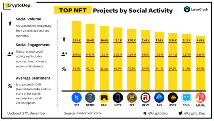크립토뎁이 발표한 27일 NFT 프로젝트의 소셜 활동량 순위에 따르면 테조스(XTZ)에 대한 언급 및 활동량이 2.74만 건을 기록해 1위를 차지했다. 2~5위는 NFT북스(2.04만 건), 라리블(1.64만 건), NFTb(1.51만 건), TCT(8520건)이었다.