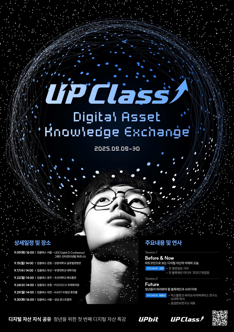 업비트는 올해 하반기 교육 대상을 시니어에서 청년으로 확장, 2030 대상 업클래스를 진행한다. 9월 9일 서울에서 열리는 ‘업비트 D 컨퍼런스 2025’에서 시작해 카이스트, 포스텍, 강원대, 부경대, 조선대 등 전국 5개 대학교를 순회한 뒤 서울 강남구 SJ쿤스트할레에서 여정을 마무리할 예정이다. 참가비는 모두 무료다.