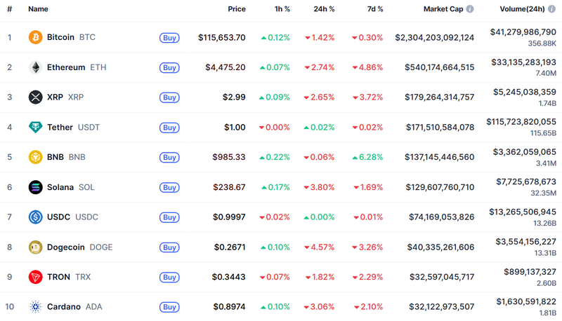 국제 금융시장에서 위험자산 선호 심리가 되살아났음에도 불구하고 암호화폐 시장은 여전히 약세 흐름을 이어갔다. 비트코인(Bitcoin, BTC) 은 11만 5,653달러로 전일 대비 1.42% 하락했으며, 이더리움(Ethereum, ETH) 역시 4,475달러로 2.74% 하락했다. 시가총액 상위권 알트코인들도 대부분 약세를 보이며 단기 조정세가 지속되고 있다.