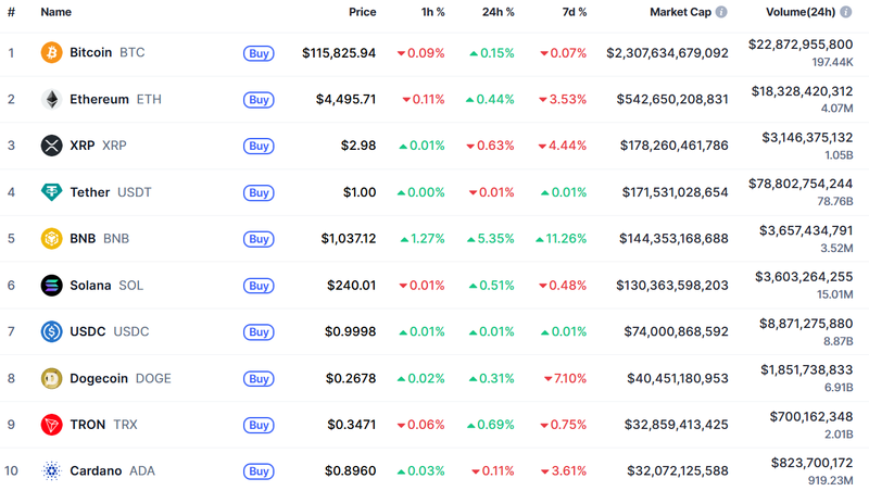 9월 21일(한국시간) 오전 7시 30분 암호화폐 시황 중계사이트 코인마켓캡에 따르면, 비트코인(Bitcoin, BTC)은 11만 5,826달러선에서 소폭 하락세를 보였으나 전체 시가총액은 여전히 2조 3,000억 달러를 상회하며 시장의 중심을 유지했다. 이더리움(Ethereum, ETH)은 4,495달러로 24시간 기준 0.44% 상승했으나, 1주일 기준으로는 3% 넘게 하락했다.
