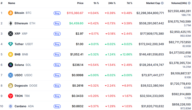 코인마켓캡 데이터에 따르면, 오전 7시 35분 기준 비트코인은 24시간 동안 0.39% 하락했고, 이더리움은 0.73% 떨어졌다. 리플의 엑스알피(XRP)는 2.97달러로 0.18% 내렸으며, 도지코인(Dogecoin, DOGE)은 0.2616달러로 2.24% 급락했다. 반면, 바이낸스코인(BNB)은 1,052달러로 12.66% 급등하며 독보적인 상승세를 기록했다.