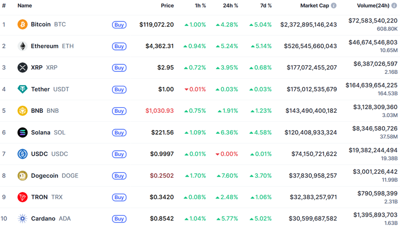 비트코인(BTC)을 중심으로 주요 암호화폐가 동반 상승세를 이어가며 시장에 강한 낙관론이 확산되고 있다. 2일 오전 9시 20분(한국시간) 기준 비트코인은 11만 9,072달러를 기록하며 24시간 동안 4.28% 상승했고, 주간으로는 5.04% 올랐다. 시가총액은 약 2조 3,728억 달러로 전체 시장을 주도했다. 이더리움(ETH)은 4,362달러로 5.24% 뛰며 상승 폭을 키웠다.