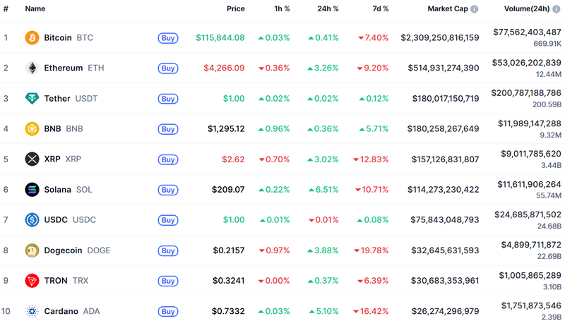 14일 오전 7시 5분 기준(한국시간) 비트코인(Bitcoin, BTC) 가격은 1BTC당 11만 5,844달러로 24시간 전보다 0.41% 상승했다. 이더리움(Ethereum, ETH)은 3.26% 급등한 4,266달러를 기록했다. BNB는 0.36% 상승한 1,295달러, 솔라나(Solana, SOL)는 6.51% 급등한 209달러로 강세를 보였다. 리플의 엑스알피(XRP)는 3.02% 오른 2.62달러였다. 도지코인(Dogecoin, DOGE)도 3.88% 상승해 0.2157달러를 기록했다.