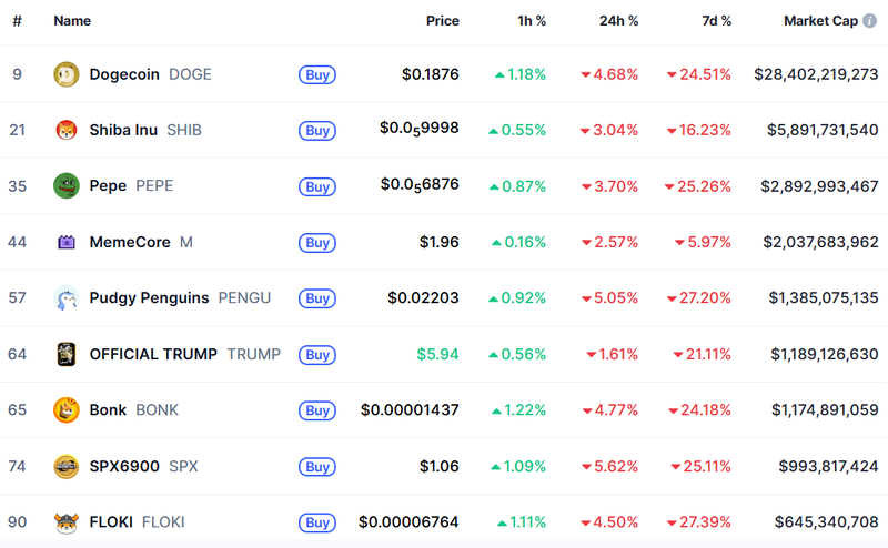 10월 17일 오전 6시 48분(한국시간) 기준 암호화폐 시황 중계 사이트 코인마켓캡에 따르면, 도지코인은 0.1876달러로 전일 대비 4.68%, 주간 24.51% 하락했다. 시바이누는 0.00009998달러로 24시간 동안 3.04% 하락, 주간 낙폭은 16.23%에 달했다. 페페(Pepe·PEPE) 역시 0.00006876달러로 하루 새 3.70%, 주간 25.26% 급락하며 투자 심리 위축을 반영했다.