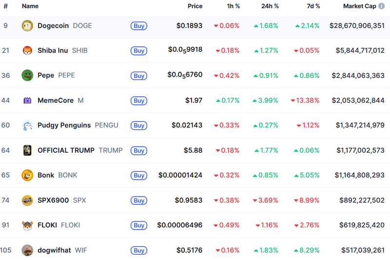 10월 19일(한국시간) 오전 8시 현재 기준 암호화폐 전문매체 코인마켓캡에 따르면, 도지코인(Dogecoin, DOGE)은 1DOGE당 0.1893달러에 거래되고 있으며 24시간 기준 1.68% 상승했다. 시가총액은 286억 달러로 밈 코인 중 가장 높은 수준을 유지하고 있다. 시바이누(Shiba Inu, SHIB)는 0.000009918달러로 1.27% 올랐고, 페페(Pepe, PEPE) 역시 0.0000056760달러로 0.91% 상승했다.