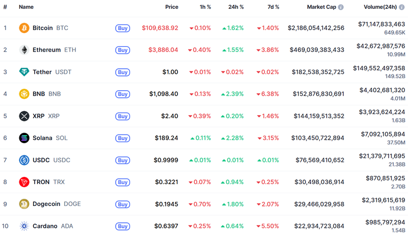 코인마켓캡에 따르면, 비트코인은 24시간 기준 1.62% 상승한 10만 9,638.92달러에 거래되고 있다. 이더리움도 1.55% 올라 3,886.04달러를 기록했다. 시가총액 상위 알트코인 중에서는 BNB가 2.39% 오른 1,098.40달러, 솔라나(Solana, SOL)가 2.28% 상승한 189.24달러를 기록하며 강세를 보였다. 도지코인(Dogecoin, DOGE)은 1.80% 상승해 0.1945달러로 회복세를 이어갔다. 반면 XRP는 0.20% 상승에 그치며 상대적으로 부진한 흐름을 보였다.