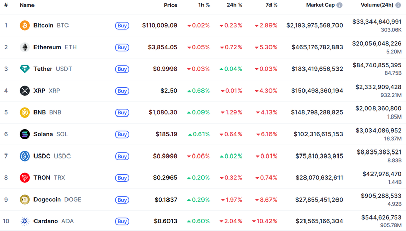 11월 3일 암호화폐 전문매체 코인마켓캡 데이터에 따르면, 한국시간 오전 6시 35분 기준 비트코인은 11만 0009.09달러로 24시간 기준 0.23% 하락했다. 이더리움은 3,854.05달러로 0.72% 내렸으며, XRP는 2.5달러로 보합권(-0.01%)을 유지했다. 솔라나는 185.19달러로 0.64% 떨어졌고, 도지코인은 0.1837달러로 1.97% 하락했다. 카르다노는 0.6013달러로 2.04% 내렸다.