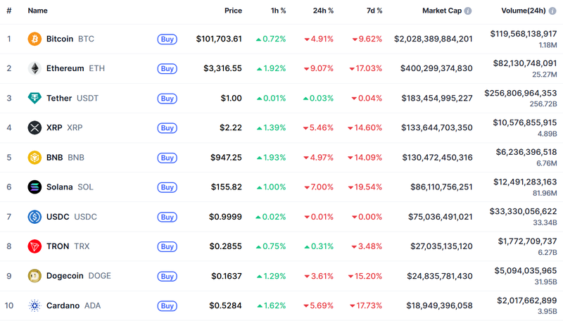 한국시간 11월 5일 낮 12시 25분 기준 코인마켓캡 데이터에 따르면, 비트코인은 전일 대비 약 4.91% 하락한 10만 1,703달러 부근에서 거래 중이며, 1시간 단위로는 0.72% 상승하며 제한적 기술적 반등을 기록했다. 이더리움(Ethereum, ETH)은 3,316달러로 하루 새 9.07% 급락했으나 1시간 반등률은 1.92%였다. 리플의 엑스알피(XRP)는 2.22달러로 5.46% 하락했지만 1.39% 반등했고, 솔라나(Solana, SOL)는 155.82달러로 하루 7% 떨어진 후 1% 회복했다.
