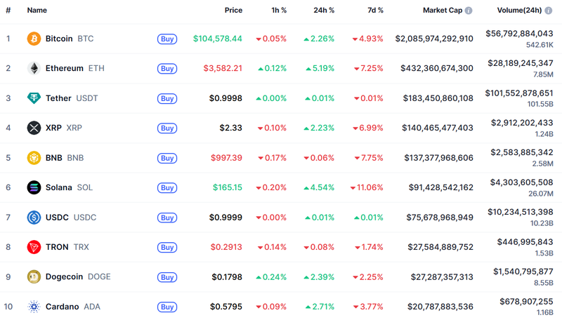 비트코인(Bitcoin, BTC)이 10만 4,000달러선을 회복하며 심리적 지지선을 지켰다. 전일 대비 2.26% 상승한 10만 4,578달러로 거래 중이며, 이더리움(Ethereum, ETH) 역시 5% 넘게 상승해 3,582달러까지 반등했다.