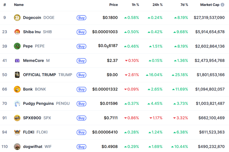 코인마켓캡에 따르면 도지코인은 0.180달러로 0.24% 상승, 시바이누는 0.00001003달러로 0.42% 오르며 안정세를 보였다. 페페는 1.51% 오른 0.00006187달러를 기록했다. 전일 강한 상승세 이후 차익 실현이 나타났지만, 전체 거래량은 여전히 견조한 수준을 유지하고 있다.