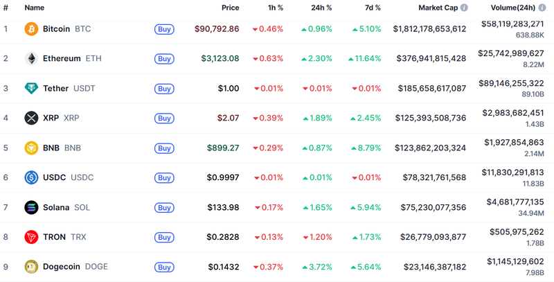 12월 9일(한국시간) 코인마켓캡 기준, 비트코인(BTC)은 9만 792달러로 24시간 기준 0.96% 상승했다. 이더리움(ETH)은 3,123달러로 하루 만에 2.30% 오르며 강한 회복세를 보였고, 엑스알피(XRP)는 2.07달러로 1.89%, 바이낸스코인(BNB)은 899달러로 0.87% 상승했다. 시가총액 상위 알트코인 가운데서는 솔라나(SOL)가 1.65% 오르며 반등 흐름을 확실히 지지했다.