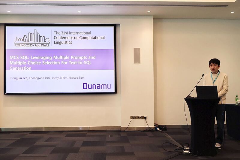 두나무 머신러닝(ML)팀은 1월 아랍에미리트 아부다비에서 열린 국제전산언어학술대회 ‘콜링 2025(COLING 2025)’ 메인 콘퍼런스에서 텍스트-SQL 변환 관련 연구 논문을 발표했다. 콜링은 자연어 처리(NLP)와 전산언어학 분야에서 세계적으로 권위 있는 국제 학회로, 심사 기준이 매우 엄격하다.