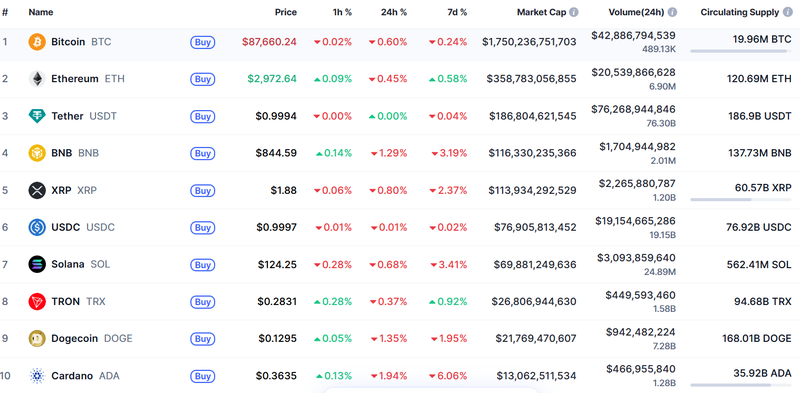 ◇ 비트코인 8만 7,660달러 횡보... 알트코인도 일제히 하락