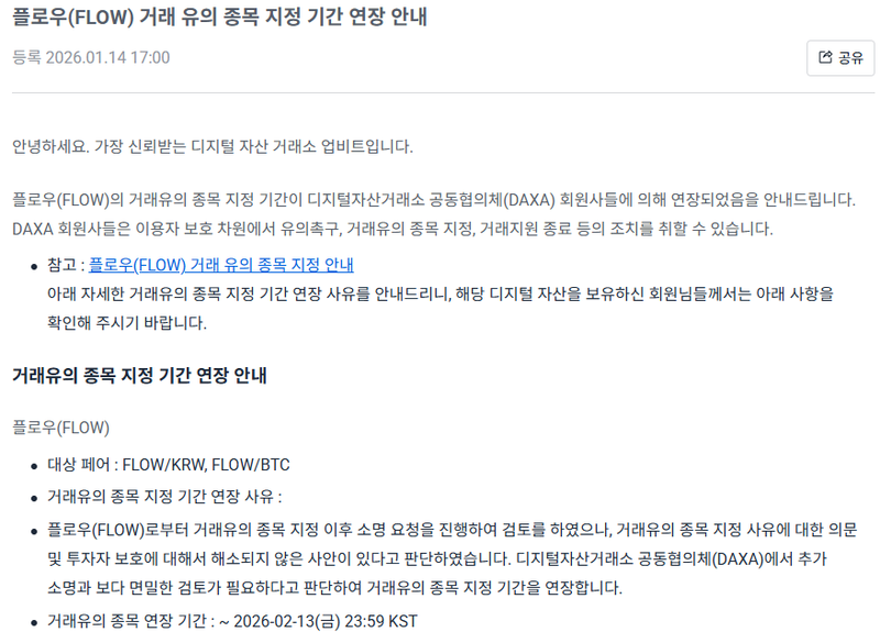빗썸과 업비트, 코인원이 플로우(FLOW)가 디지털자산거래소 공동협의체(DAXA) 회원사들에 의하여 거래유의종목 지정이 연장됐다고 공지했다. 거래소는 "유의종목 지정에 관한 사실관계 및 후속조치 등에 대하여 프로젝트 측으로부터 소명을 받고 이에 대한 추가적인 검토 절차를 진행하고 있다. 보다 면밀한 검토를 위해 거래유의종목 지정을 연장한다"고 설명했다.