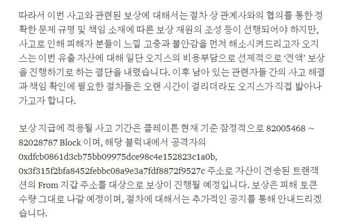 전날 해킹으로 22억원어치 가상자산을 도난당한 클레이스왑이 피해자금을 전액 보상하기로 했다고 공식 미디움을 통해 밝혔다. 클레이스왑 운영사 오지스가 선제적으로 보상 비용을 부담하고, 이후 사건 해결 및 책임 확인 절차를 밟아나가겠다는 설명이다. 보상 지급에 적용될 사고 기간은 클레이튼 현재 기준 잠정적으로 82005468 ~ 82028787 블록이며, 해당 블록 내 공격자 주소로 자산이 전송된 트랜잭션의 From 지갑 주소를 대상으로 보상이 진행될 예정이다. 보상은 피해 토큰 수량만큼 제공된다. 앞서 3일 클레이스왑은 외부 해킹 공격으로 약 22억원에 달하는 가상자산이 특정 지갑으로 출금되는 피해를 입었다.