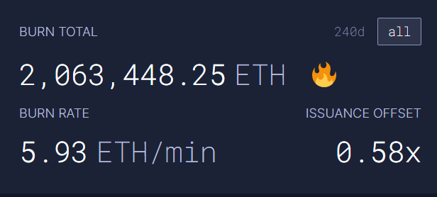 이더리움(ETH) 소각 관련 데이터 플랫폼 울트라사운드머니에 따르면, 4일 기준 이더리움 네트워크가 소각한 ETH 누적 소각량이 약 206만 ETH를 기록했다. 현재 시세 기준 ETH 누적 소각량의 달러 가치는 72억 달러 상당이다. 현재 ETH 네트워크의 ETH 소각 속도는 분당 평균 5.93 ETH다.