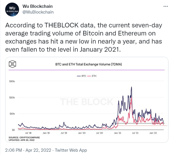 이날 우블록체인은 더블록 데이터를 인용해 현재 거래소에서 비트코인과 이더리움 일주일 평균 거래량이 지난해 1월 수준까지 떨어지면서, 약 1년 만에 최저치를 기록했다고 전했다.