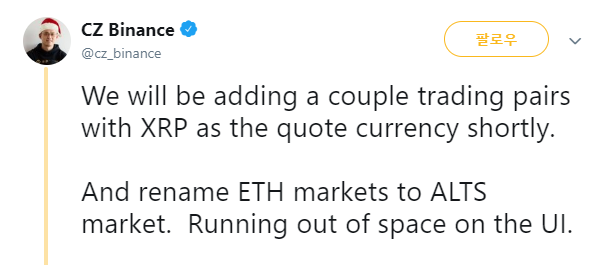 중국계 암호화폐 거래소 바이낸스 CEO 자오창펑(赵长鹏)이 23일(현지시간) 자신의 트위터 계정을 통해 "바이낸스에 리플(XRP)를 가격표시통화(quote currency)로 한 마켓을 오픈할 예정"이며 "이더리움(ETH) 마켓을 'ALTS 마켓'으로 이름을 변경할 것"이라고 밝혔다. 가격표시통화란 한 통화쌍에서 가격을 제시하는 기준이 되는 통화를 의미한다. 한편 바이낸스는 "24일 20시 XRP 마켓에 트론(TRX), 지코인(XZC)을 상장할 예정"이라고 공지했다.