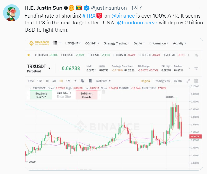 루나 95% 폭락...트론 창업자 "TRX가 LUNA 다음 타깃, 20억달러 투입으로 방어"테라의 루나(LUNA) 코인이 95% 폭락한 가운데 저스틴 선(Justin Sun) 트론(Tron, TRX) 창업자가 11일(현지시간) 자신의 트위터를 통해 "바이낸스 거래소에서 TRX 숏 펀딩비율이 100% APR(연이율)을 넘어섰다. TRX가 루나의 다음 타깃이 될 것 같다. 그들과 싸우기 위해 20억 달러를 투입할 것이다"라고 밝혔다.