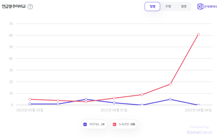 3월 29일부터 4월 4일까지 일주일간 카르다노는 14회, 도지코인은 106회 언급됐다.