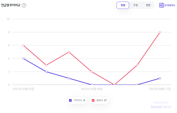 카르다노 vs 솔라나, 언급량 추이는? 4월 5일부터 4월 11일까지 일주일간 카르다노는 8회, 솔라나는 27회 언급됐다.