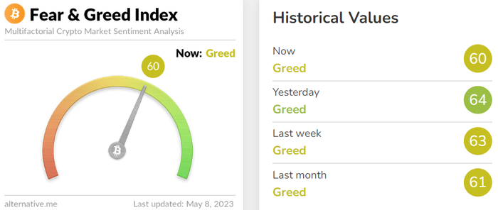 비트코인의 투자심리는 전날보다 소폭 위축된 모습이다. 이날 암호화폐 데이터 제공 업체 얼터너티브(Alternative)의 자체 추산 '공포·탐욕 지수'는 전날보다 4포인트 내린 60를 기록했다. 다만 '탐욕' 단계는 지속됐다. 해당 지수는 0에 가까울수록 시장의 '극단적 공포'를 나타내며, 100에 가까울수록 '극단적 낙관'을 의미한다.