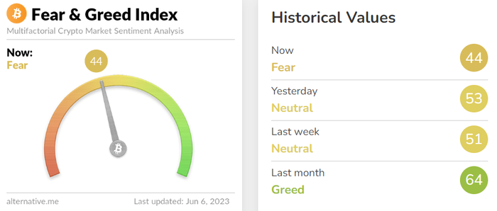 비트코인의 투자심리도 크게 위축됐다. 이날 암호화폐 데이터 제공 업체 얼터너티브(Alternative)의 자체 추산 '공포·탐욕 지수'는 전날보다 9포인트 떨어진 44를 기록하며 '중립' 단계에서 '공포' 단계로 전환됐다. 해당 지수는 0에 가까울수록 시장의 '극단적 공포'를 나타내며, 100에 가까울수록 '극단적 낙관'을 의미한다.