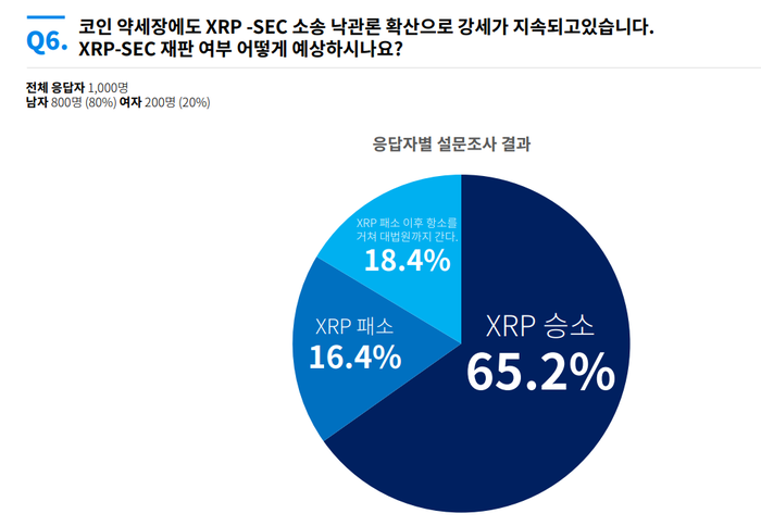 한편 미국 증권거래위원회와 리플(XRP) 간 소송의 승자를 전망하는 질문에 대해서는 65.2%가 리플이 승소할 것으로 전망했다. 패소를 전망한 응답자는 16.4%로 나타났다.