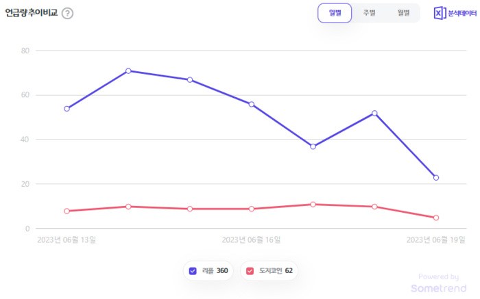 리플 vs 도지코인, 언급량 추이는? 6월 13일부터 6월 19일까지 일주일간 리플은 360회, 도지코인은 62회 언급됐다.