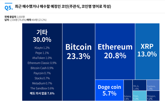 이번주 매도 예정 암호화폐를 묻는 질문에 대해서는 가장 많은 응답자가 이더리움을 꼽았다. 비트코인, 리플, 도지코인, 솔라나, 아하토큰, 트론, 밀크, 폴리곤 등이 뒤를 이었다.